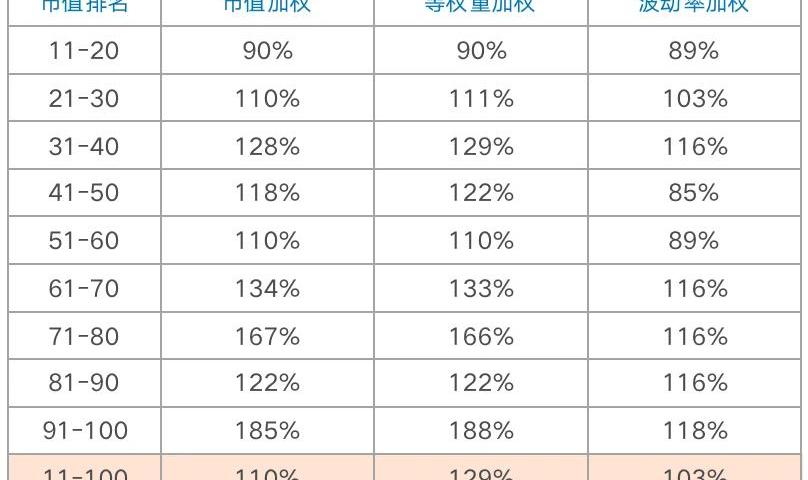 注:采用2020年11月的市場數據表5展示了市值前十以外的組合情況,這部分加密貨幣使用波動率加權可以降低投資組合的預期風險,原因可能是市值排名11至100的加密貨幣市值和波動率的分化沒有那么嚴重。表5:不同加權方式的預期風險對比
