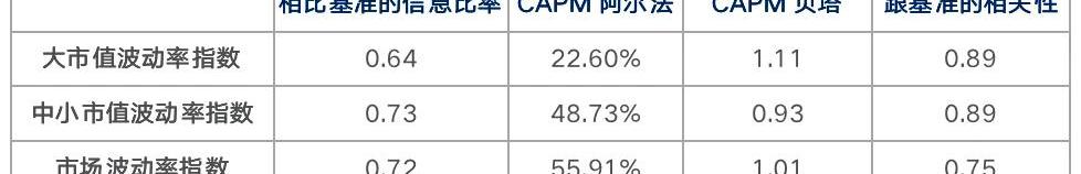 注:大市值組合指的是市值排名前10的組合;中小市值組合指的是市值排名11至100的組合;市場組合指的是市值排名前100的組合信息比率從主動管理的角度描述風險調整后收益,衡量單位主動風險所帶來的超額收益,信息比率越高,說明投資組合表現持續優于基準的程度越高。從股票和債券市場的統計數據來看,只有頭部5%的主動基金經理能夠獲取超過0.5的信息比率。以市值加權作為基準,波動率加權指數獲得了超過0.6的信息比率,說明波動率加權指數的表現在很大程度上優于市值加權指數。從阿爾法收益指標來看,波動率加權指數也獲得了明顯的主動回報。意料之中,由于前文提及的原因,包含比特幣的大市值和市場波動率指數貝塔系數有所提高,而中小市值波動率指數貝塔系數有所降低。表6:波動率加權表現指標