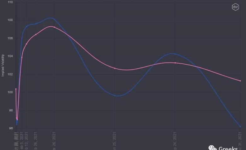 ETH歷史波動率10d177%30d153%90d111%1Y110%以太坊今日期權成交量1.06億美元,持倉量19億美元,以太坊成交量略高于平均水平。各標準化期限IV:今日:1m151%,3m145%,6m136%1/26:1m146%,3m144%,6m141%以太坊在新高附近,短期限IV稍有下降就被買起來,整體曲面比較平滑。