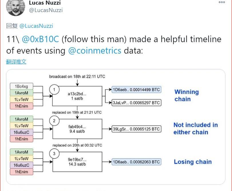 11、推特用戶@0xB10C利用@coinmetricsdata做出了有關該事件的時間線,可以幫助大家了解具體情況: