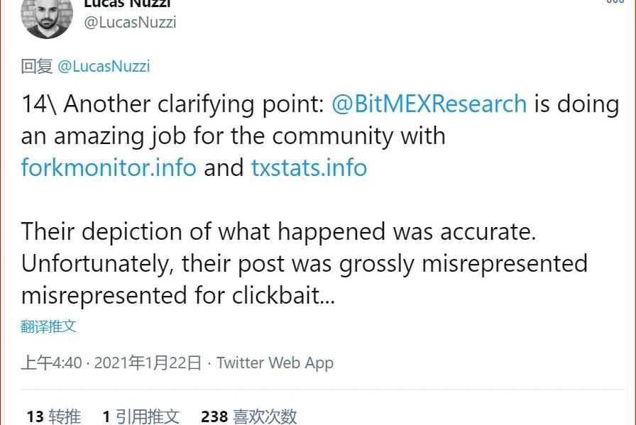 14、再加上一條澄清證據:@BitMEXResearch通過forkmonitor.info和txstats.info為比特幣社區做出了驚人的貢獻他們對所發生事情的描述是準確的。不幸的是,他們的帖子被嚴重歪曲為操縱市場的誘餌…