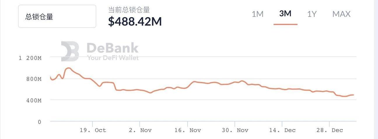 而另一個值得關注的數據,則是其合成資產的日交易量情況。根據官網數據顯示,Synthetix協議的合成資產日交易量在1月3日達到了7967萬美元,同樣創下了歷史新高,而近期的趨勢則為上升趨勢。5、yearn.finance鎖倉量下滑趨勢明顯