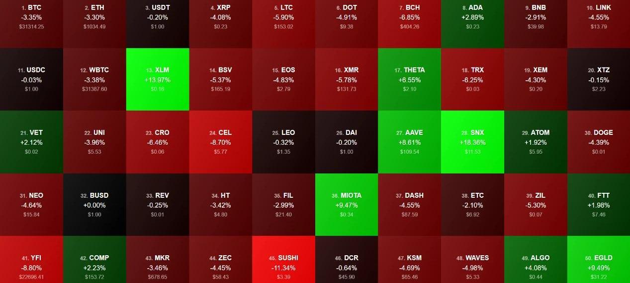 在過去24小時內,比特幣價格迎來一段回調。此次比特幣價格回調,主流貨幣行情遭遇一輪震蕩,TOP50的數字貨幣中,38種數字貨幣均出現下跌,其中SUSHI跌幅最高,達11.34%。
