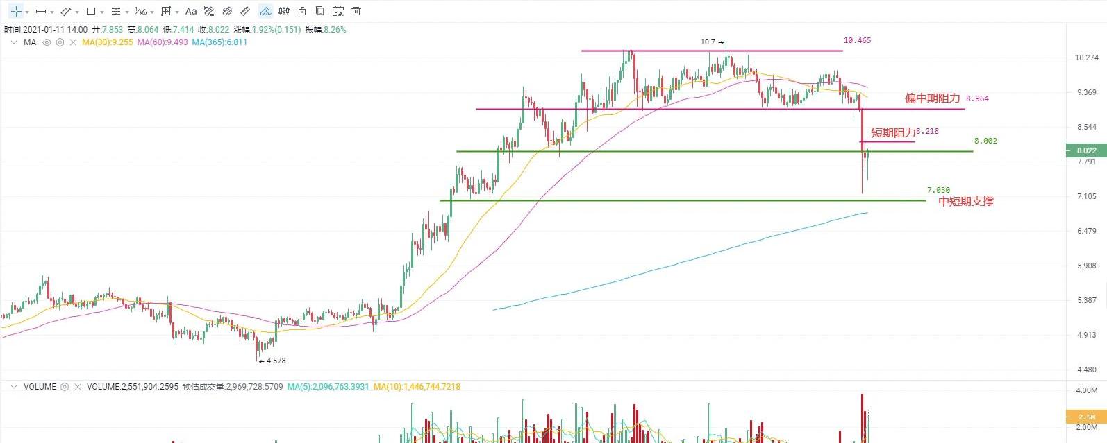 DOT本輪跌幅相對較大,昨日至今天的最大跌幅一度逼近30%。在看到BTC大幅下挫的情況下不難預知DOT可能會跌幅更甚,因為在本輪大跌之前DOT的上漲強度就已經明顯減弱,正所謂強者恒強,弱者恒弱,通過對比幣種之間的強弱關系可以幫助我們提高成功率,降低風險。從走勢結構看,DOT偏中期的多頭結構遭到一定破壞,因為作為中期強弱分界線的8.0一線支撐出現了破壞,雖然現在依然在該價位附近徘徊,但在沒有明顯上破8.2之前,局勢對空頭更加有利,不建議去追逐反彈。下方支撐重點關注靠近7.0附近區域,若在跌至該區域且出現止跌信號易引發短線抄底資金介入。支撐:7.60--7.00--6.70阻力:8.20--8.90--9.40