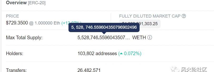 https://ethgasstation.info/index.php上圖是近30天以太坊內合約消耗GAS量的排行榜,目前穩居第一的是uniswap,一個月光平臺消耗gas費用就可達到1270萬美金,除開一些token分發類的高頻次合約之外,再往下除了穩定幣,基本也就是各類dex。可以說今年以太生態,有一大半因素要源于各類dex的崛起,特別是像uni這樣無門檻的AMM自動做市模式,造福了一大片上不去主流平臺的小市值項目,而這里面每個幣的交易前提都是需要一定ETH作為資金池底倉,而且這還不止uni一家,目前weth,也就是通過eth1:1映射的erc20代幣,主要負責與各類生態幣交互的總量就超過550萬枚: