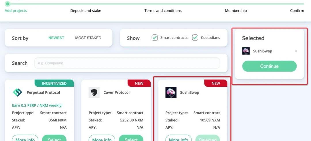 NexusMutral的設計比較有趣,它的設計初衷是要復原來自2000多年前東方文明的保險智慧:相傳在2000多年前的中國,商人運貨經常需要走水路,但是那樣很容易導致翻船,他的貨物就會全部損失。于是,人們想到一個辦法,就是許多商人團結在一起,一起把貨物運過去,假如10個商人一起運貨,那每個人的船上都帶有10個人貨物的1/10的量,這樣要是翻了一艘船,也只是所有人損失了自己貨物的1/10,這顯然對所有人是最優的方式。這就是通過集體的力量分散風險的最古老的方式。不過因為這種方式能連接的人太有限,這種保險模式很難規模化,這才有了西方的中心化保險體系。但是現在這種體系暴露了一些問題:信息不對稱、說服一個人投保成本高、監管壓力大、保險理賠時投保人只能得到一部分、業務成本高等等。但是一些去中心化的擁躉們發現,區塊鏈網絡的去中心化思想反而能讓保險回歸到2000年前中國的那種形態——也就是說,打破中心化的保險格局,讓所有的保險參與者都通過stake的方式承擔風險,并賺取收益。通過經濟模型的設計,激勵人們更愿意參與到協議里來,消除了信息不對稱,并大幅度的降低了監管壓力。換句話說,就是DeFi里的共同基金式的保險。如同其創始人所言:Itallowsthecooperativeethostoberegainedwhilepreservingthebenefitsofdiversification.NexusMutual系統經濟模式運行的核心是NXM代幣,這種代幣不被允許上交易所,這樣就免去了被操縱價格的風險。一個用戶可以成為投保人,也可以成為承保人。簡單而言,如下圖一個人可以通過進入其保單的頁面,選擇一個保單,然后設定要保的價值,以及讓協議給你保多久,然后就會生產一個保單的報價,用戶只需通過metamask就可以用ETH、DAI或者NXM為保單付款,這樣如果他在Sushi的合約上有資產,一旦Sushi發生漏洞導致你的財產損失,NexusMutual就會為你賠付盡可能最多的數量。