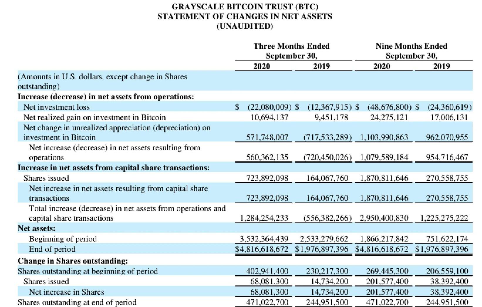 如果說,DeFi在Q2季度促進了加密資產市場的回暖,那么從Q3開始,灰度信托管理資產的增長對加密市場的影響開始凸顯。BTC從6月初截止至12月14日,累計漲幅達到101.03%。2013年,灰度公司成立之初就推出了BTC信托產品GBTC。GBTC持倉量大幅增加,始于2020年Q2。據灰度公司季報,灰度Q3加密資產管理規模約48.16億美元,較Q2則增長12.84億美元,同比增長36.35%,環比增長143.72%。截止12月14日,灰度公司數字資產管理總規模達127.03億美元。灰度公司本身不持有BTC,僅提供加密資產信托服務,目前包含GBTC、BCHG、ETHE、ETCG、ZEN、LTCN、LXM、XRP、ZEC九個信托產品。