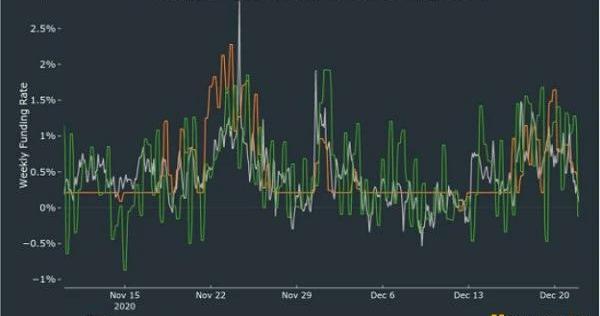 如上圖所示,溢價在過去七天由18%上升至40%。這一異常漲幅部分原因是新股暫時停牌。盡管這一漲幅并不常見,但六個月之前也發生過類似情況。機構投資者無法從交易所直接買入該信托基金,產生了額外需求,而只有二級市場才能滿足這些需求,造成了溢價上漲壓力。永續期貨資金費率穩定