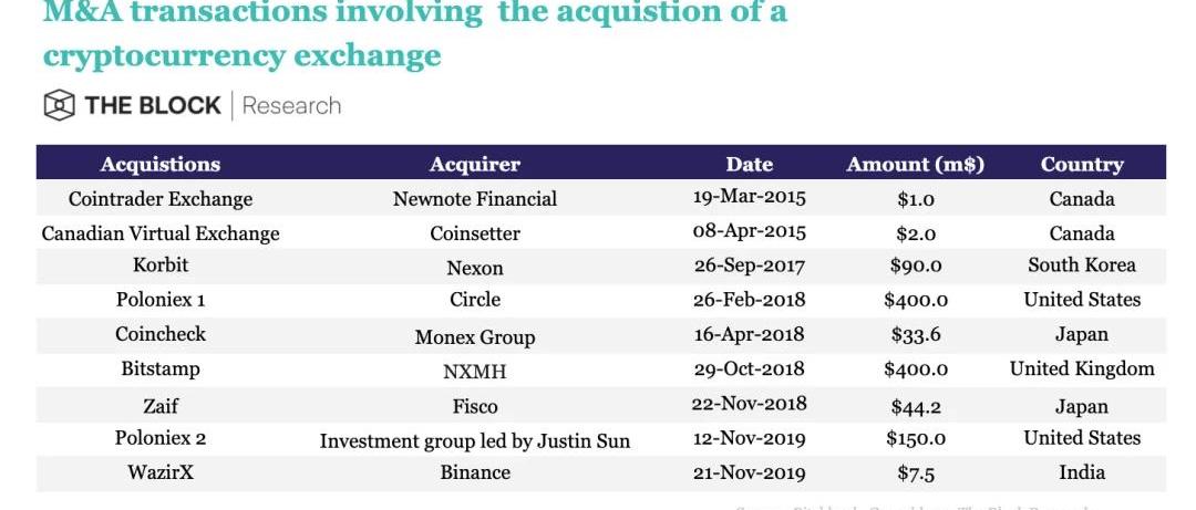 加密貨幣交易所已經完成了24筆后期融資。后期風投的平均交易規模約為6,020萬美元,中值交易規模為2,700萬美元。大約75%的融資發生在2017年。隨著行業開始成熟,這些交易開始流行。大洋洲是唯一一個只有一家交易所進行后期融資的地區。在北美,Coinbase、Kraken和Paxos都進行了后期的融資。在亞洲,BitFlyer、Bithumb、Liquid、OKCoin、Unocoin和Upbit都進行了后期融資。在歐洲,Bitpanda和eToro都進行了后期融資。類似的交易也在非洲與Aza(以前的BitPesa)、中東地區的Emirex、以及南美洲的Bitso和Ripio達成。兼并和收購