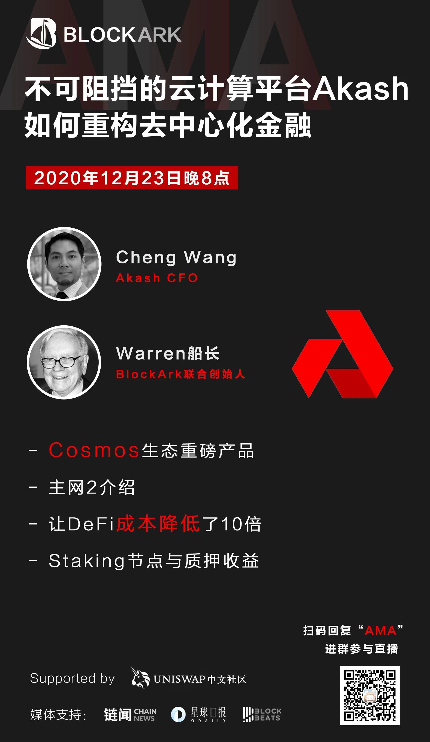 Warren:大家好啊,歡迎參加今天由BlockArk在Uniswap中文社區舉辦的AMA,我是今天的主持人Warren船長,BlockArk聯合創始人。同時感謝星球日報、鏈聞、區塊律動等媒體對本次活動的支持。Warren:在活動開始前容我先簡單介紹下BlockArk。BlockArk是一家加密資產行業的投資銀行與市場營銷機構,旗下管理專注加密貨幣一二級基金ArkStreamCapital。BlockArk集投資、品牌、市場增長、戰略咨詢為一體,致力于推動Web3.0的獨角獸們成長。Warren:今天AMA的主題是“不可阻擋的云計算平臺Akash如何重構去中心化金融”,嘉賓是Akash的CFO,ChengWangWarren:Hello@ChengWang(王振寅)|CFOAkash給大家打個招呼吧!Cheng:大家早上好!感謝您參加今晚的活動。我是Akash的首席財務官Cheng,今年3月/4月我加入了我們的團隊。Cheng:我最初的職業生涯是在傳統金融機構工作了近十年,曾在多家投資銀行工作,最后一站是高盛。從那以后,我開始擔任多家不同的初創公司的首席財務官,自2018年以來我一直在區塊鏈領域工作。Warren:歡迎Cheng!那我們今天的AMA現在開始。Warren:今天的AMA活動分為兩個階段,第一個階段為主題問答,我會提出8個提前準備好的問題,以一問一答的形式進行。8個問題結束后,會進入第二個階段,自由問答。群友可以對嘉賓自由提問,嘉賓自由選擇其中3-5個問題進行回答。Warren:第一個問題,我們希望給我們的用戶有一些科普,云計算是一個非常廣泛的概念,Akash做的是去中心化的云計算市場,能否為我們簡單介紹下何為去中心化云計算?在這個領域,Akash想要實現的愿景是什么?Cheng:AkashDeCloud上的中心化云計算的概念主要體現在,AkashDecloud上的托管應用程序的服務器不依賴任何一個中心化的實體。從Equinix和Packet等大型數據中心到AkashSupermini等家用計算機,Akash上的提供商分布在全球各地。中心化云服務提供商缺點明顯:定價效率低下,缺乏靈活性和具有壟斷性等等。我們想為這些服務商提供新的替代方案,并且這些方案在預計到2023年的將占據71%的市場份額。Akash的使命是使用去中心化的計算集群網絡來打破這種寡頭壟斷,在點對點的市場中提供資源以建立一個具有彈性的并且不可阻擋的云市場,并且用戶的購買云服務的成本將是比現在的市場價格便宜2-3倍。Warren:好的,感謝Cheng給大家的科普。可以看到,云計算是一個非常龐大的市場,Akash的加入希望能夠打破目前巨頭壟斷的格局。我們第二個問題是和中心化云服務提供商相比,Akash有哪些優劣?和其他同屬于的去中心化云計算范疇的項目相比,比如一些去中心化云服務器,去中心化云存儲的項目,Akash又有什么不同?Cheng:好問題!云計算行業由四個集中式云服務提供商所壟斷:AmazonWebServices,GoogleCloud,MicrosoftAzure和AlibabaCloud。這些云服務提供商缺乏靈活性而且成本很高。Akash為現有的云用戶提供了一套獨特的方案,使Akash在云計算市場中具有很強的競爭力:1.較低的成本:Akash由用戶設定價格,提供商通過競爭來獲得用戶。這樣一來價格始終較低,因為它是受自然的供求規律的驅動。2.不可阻擋的:在Akash上運行的App只能由其所有者停止,這樣可以確保其彈性。3.較高的生產率:以人為本的設計,開發人員可以事半功倍。4.較高的私密性:即使具有物理訪問服務器權限的人也不會威脅到App的安全-沒有人可以阻止用戶使用Akash。一些人建議在去中心化,可拓展性和成本三者之間進行權衡。Akash在這個選擇題中不會有任何猶豫。唯有去中心化才能使Akash真正的不可阻擋。去中心化意味著任何人都不可以刪除用戶的APP或檢查Akash上的內容,因為如果運行APP的提供商出現了故障,用戶的APP就會找到一個新的提供商。Akash為主流云技術構建,與現有的云應用程序和公司的技術堆棧兼容,沒有固定的供應商,因此具有非常好的可擴展性。云技術的基礎架構領域目前市值達到2020億,Akash作為其中的一員,與其他項目如Dfinity、Ankr、Akash,基礎架構即服務等有本質上的不同。Dfinity更加關注智能合約,他們的PoS提高了運行時的吞吐量,但是智能合約存在局限性。我們發現Dfinity更加接近Akash的模型,但是對它們的源代碼了解并不深入。目前,Ankr也沒有做到像Akash一樣無需經許可或非托管模式。我們是一個云計算平臺,而不是一個云存儲平臺。Akash上的分布式計算是臨時存儲的,因此大容量存儲解決方案將成為我們的關鍵集成。我們已經與Storj和Filecoin達成了合作解決方案。Warren:確實,雖然很多區塊鏈項目或多或少涉及到云計算,但各自專注的領域不同。第三個問題是,為何選擇Cosmos和Tendermint作為開發框架?Cosmos相比于其他跨鏈項目,比如Polkadot,有什么樣的優勢?在Cosmos生態中,Akash將和其他項目發生怎樣的聯動?Cheng:Cosmos和Polkadot是使用了不同技術的和不同解決方案的項目。自2017年以來Cosmos的底層共識算法Tendermint一直支持著公鏈交易。隨著幣安鏈于2019年初推出,它現在穩定在數十億美元的價值。Tendermint之所以吸引我們,是因為它的模塊化和設計的靈活性。由于它的迭代速度快和社區動力足,所以我們選擇在Tendermint上構建。并且作為Go語言庫,它很適合我們的技術堆棧。成為Cosmos生態系統一部分最令人興奮的原因之一就是即將實現的跨鏈間通信協議。在Cosmos生態系統中IBC的實施將會使更多項目在CosmosHub之間交換價值,從而參與Akash的去中心化市場。通過IBC,降低了Akash的使用門檻,更多貨幣將會進入Akash云計算市