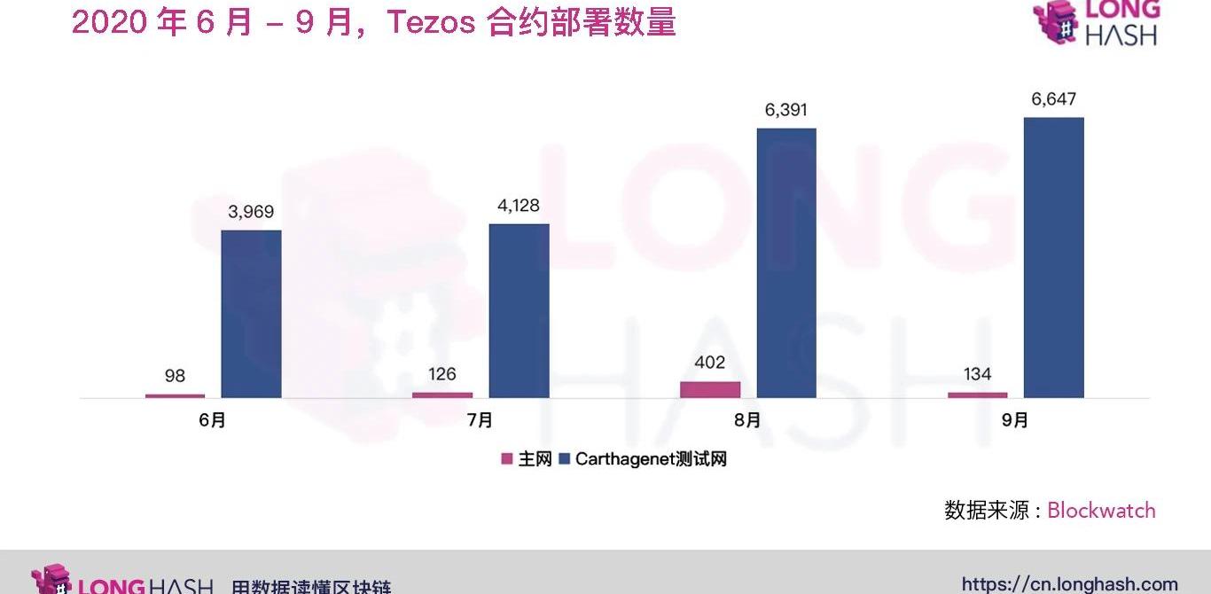此類DeFi與NFT結合類的新產品,主要用于金融類憑證確權和解決NFT的效用問題。通常NFT資產的使用效用較低。隨著海外流行的“GameFi游戲化”設計機制的植入,NFT資產變得有更多功能如“挖礦”,“競拍”等,非常適合產品開發者冷啟動其項目。以yinsure.finance為例。這是一個搭建在以太坊上的NFT項目,可提供保險合約。用戶可根據保單生成NFT代幣,每一個NFT代幣對應著一張特定期限和保險金額的保單。這些yNFT生成后就可以在NFT平臺上自由交易。據Opensea平臺以及OKex研究報告的數據顯示,該NFT保單在其平臺上的首月交易金額已經達到5000ETH。隨著DeFi用戶的涌入,市場對底層平臺的安全及效率要求逐漸提高。以太坊高居不下的Gas費用及安全問題依舊困擾著產品開發者。另一方面,其他PoS競爭鏈例如Tezos,從公開的Carthagenet測試網上數據顯示,Tezos合約部署在近幾個月有較大的增長。在2020年Q3,數量增長近70%。截止2020年9月Tezos主網80.3%的合約調用源于委托,DeFi預言機和去中心化交易占比分別為17.8%和0.4%,Tezos去中心化金融應用的生態逐漸繁榮。