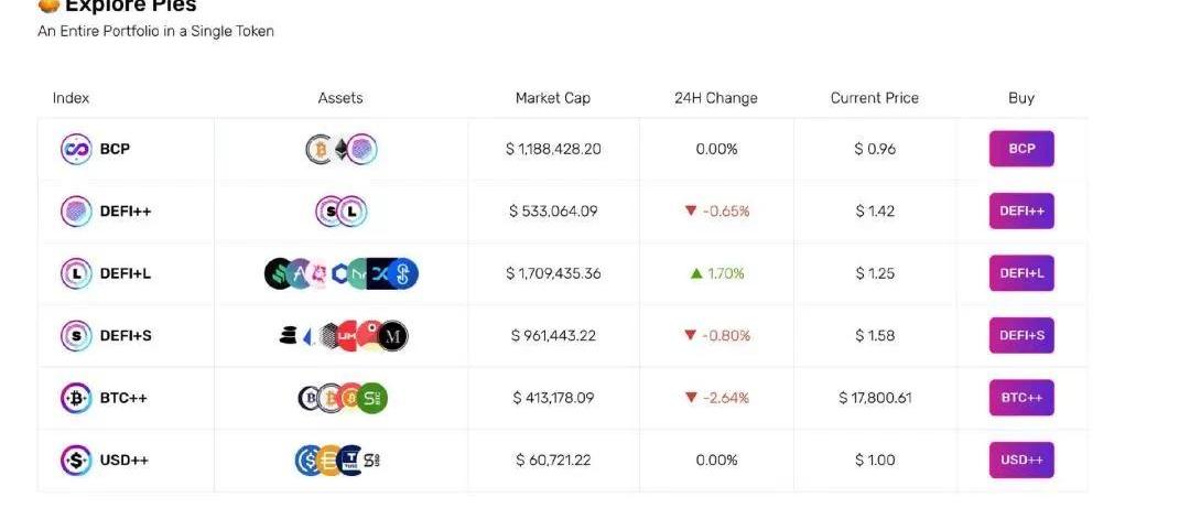 與sDeFi采用衍生品結構、只錨定價格、無真實資產支撐不同,創建于2020年3月的DeFi團隊PieDao創建的指數基金:如DeFi++、DeFi+L等,采用了有真實資產支撐的指數基金結構。簡單說來,DeFi++這類真實資產背書的指數基金,需要按照設定的比例,買入持有對應的一籃子DeFi代幣。而sDeFi這類衍生品結構的指數基金,只是錨定價格,不用持有資產,也不會兌付,可以稱之為空氣幣,其價值就是充當了對應DeFi代幣籃子的價格指標。為了幫助讀者對于DeFi指數基金多一些了解,這里會多花一些篇幅,介紹PieDAO的指數產品結構和操作。PieDAO指數產品一覽