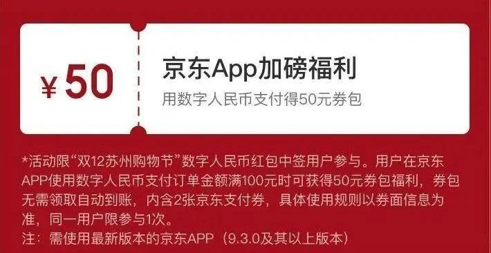 另外,在京東App通過數字人民幣進行線上支付,訂單金額滿100元即可可獲得50元劵包福利,內含2張京東支付券,具體使用規則以劵面信息為準。