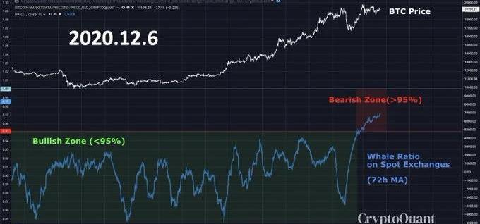 WillyWoo認為,修正即將到來,然而從長期來看,價格可能會在市場修正后進一步反彈。該分析師的推文招致了很多回應,其中一位交易員也同意了Woo的論點。“跌到12500美元左右應該很快就會開始,而且這將使整棵樹搖晃得相當厲害,并使那些自稱長線投資的弱者有所松動。這輪下跌將是越來越多的進入該領域的機構大舉買入的機會。”然而這種沒有太多技術分析來支持預測的評論,理所當然地招致了許多的批評,并給上述交易者貼上了“弱者”的標簽。關于即將到來的修正的預測可能是有一定道理的。事實上,在反彈理論之前,對這次修正的進一步調查也表明,短期看跌趨勢確實在起作用。而且這種趨勢可能已經在大多數現貨交易所呈現了,正如下圖現貨市場中鯨魚的比例似乎表明的那樣。從歷史上看,如果該指標超過95%,那么市場很可能會看跌或橫盤。