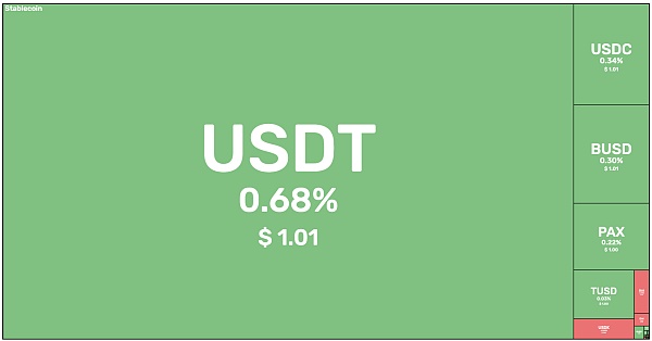 截止發稿時,在市值前50的數字貨幣中,有6家穩定幣躋身其中,包括USDT(市值排名第4)、USDC(市值排名第18位)、PAX(市值排名第28位)、BUSD(市值排名第35位)TUSD(市值排名第36位)、DAI(市值排名第44位)。