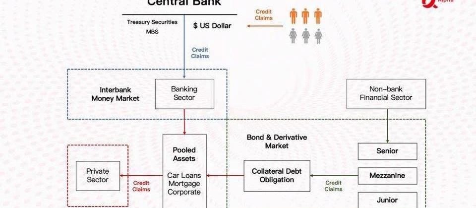 傳統金融市場的生態是豐富且復雜的,包含著各式各樣的信用和眼花繚亂的杠桿工具:國家的融資需求被打包為主權債務;私營部門如居民購房、購車、醫療教育消費等融資需求,或如企業部門的運營資本、資本開支等融資需求被打包為各類債務——這些信用是構成金融市場的基石,金融機構基于這些信用創設了債券、貸款等金融資產,并通過各種各樣的衍生工具不斷地增加杠桿。信用擴張和杠桿累積的結果,就是金融市場中整個業務鏈條上所有參與主體資產負債表的不斷膨脹。