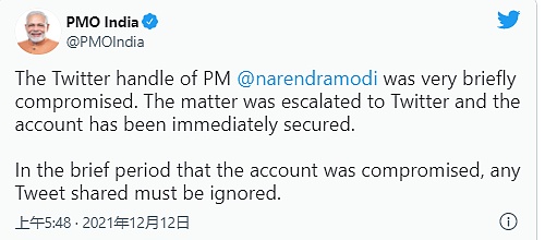 印度總理辦公室在推文中公告:“總理莫迪的推特賬號@narendrammodi被短暫盜用。此事已提交到推特平臺,該賬戶已立即得到保護。請忽略在賬戶被入侵的短時間內分享的推文。”