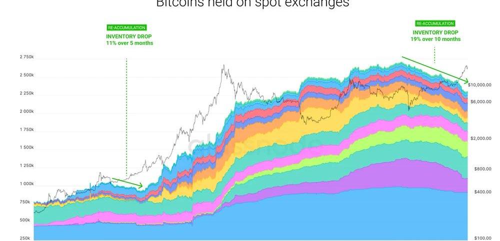 本輪牛市的再積累階段,恰逢比特幣12年歷史上現貨交易所比特幣庫存最長、最深的一次消耗。到目前為止,這種消耗已經持續了10個月,比上個周期的5個月跨度翻了一番。同樣,從交易所挖出并進入冷錢包的幣量為19%,而上個周期為11%。有鑒于此,預計2021年將被瘋狂看好。