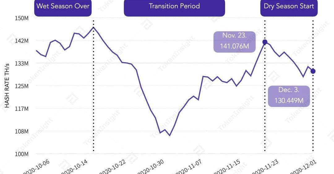 由于豐水期的結束,中國西南地區比特幣開采的廉價水電供應逐漸停止。導致了比特幣算力下降。從10月份開始,豐水期開始逐漸向枯水期轉換。部分礦工開始轉移礦機,以尋找更便宜的電價。然而,還有一部分礦工愿意等到平水期結束之后,才開始有所動作。算力方面,10月中旬到11月初,比特幣總算力下降了約四分之一。同樣,上周開始,比特幣算力從1.4107.6億TH/秒下降到了12月3日的1.3044.9億TH/秒。但這些小麻煩對礦工的熱情影響不大。比特幣礦機的庫存被搶購一空;而礦機的訂單也已經排到了2021年年中。