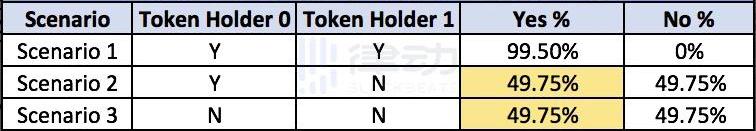 從2號持幣者的角度我們可以看到一共有2^2=4種可能情況。雖然2號持幣者只有0.5%的持幣權重,但卻足夠影響一半的情況,與其他兩名持有49.75%代幣的持幣者有著相同的決定性。治理代幣分布三:絕對決定性