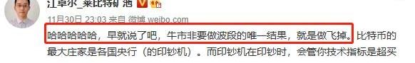 事實證明,江老師是真正有水平的。11月26日,江老師發微博稱,現在開始,應該有一波30%左右的回調,然后1月中旬才能破前高。大韭菜馬上要被BTC的波動性打一頓。今天的事情大家都知道了,江老師對此是這么說的,“跌幅20%確實沒到30%,但我都說了,短線問上帝,我又不是上帝,能猜中暴跌時間就不錯了”。確實,江老師又不是上帝,能猜中暴跌就不錯了,江老師是有水平的,江老師都猜中暴跌了,江老師真的很厲害了,你做波段做飛了吧,哈哈哈!!!
