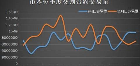 其中圖表中的數據為幣本位季度交割合約16天的日交易量數據,藍色線為9月份每日幣本位交割合約交易量,橙色為11月份每日幣本位交割合約交易量,從圖表中,我們可以看出OKEx整體的交易數據變化較為平穩,11月份整體交易量比9月份整體交易量,有所提升。為了防止數據存在一定的偏差性,小編又統計了OKEx9月份和11月份幣本位交割合約和幣本位永續合約總交易量的平均值,如圖所示:
