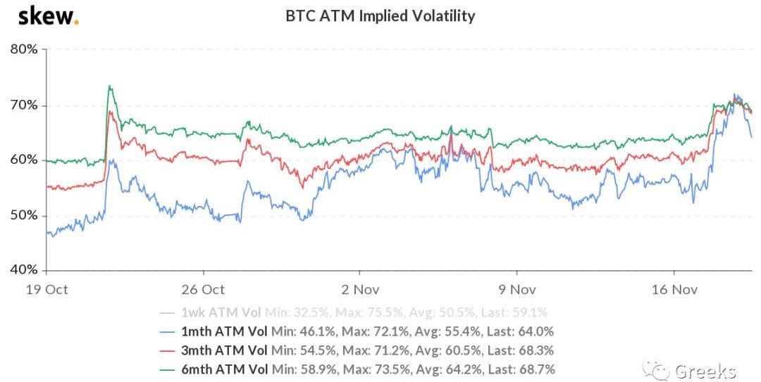 BTC歷史波動率10d59%30d63%90d51%1Y78%期權成交量7億美元,持倉量平穩,目前為35億美元。各標準化期限隱含波動率:今日:1m64.9%,3m68.2%,6m68.5%11/18:1m67.8%,3m69.5%,6m70.4%前期高點:1m65%,3m70%,6m74%