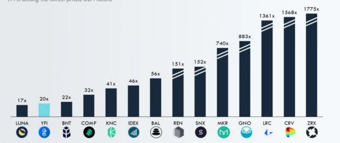 YFI的利潤價格比率意味著,如果所有YFI持有人都進行stake,他們將獲得約5%的年化回報。由于目前約有12%的YFI被放在池子里,因此YFI的參與者可以獲得約40%的年化回報,這意味著PE比率為2.4倍。最好將這些比率理解為一個范圍。目前,參與管理池的YFI持有者可獲得約40%的年化收益,但如果每個人都入股,他們將獲得~5%的年收益。5%可以看作是基于當前價格和每枚Token利潤的一個限制。