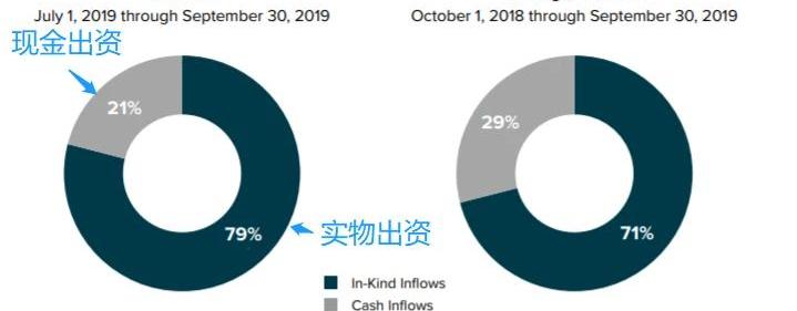 大家猜猜哪種認購模式最多?答案是,比特幣出資模式。在2019年Q3的報告中,灰度表明從2019年1月到9月,79%的投資者都是選擇實物出資。也就是說,大多數流入GBTC的比特幣來自已經在市面上流通的比特幣,并不是大家以為的“灰度正在購買新挖出來的比特幣”。