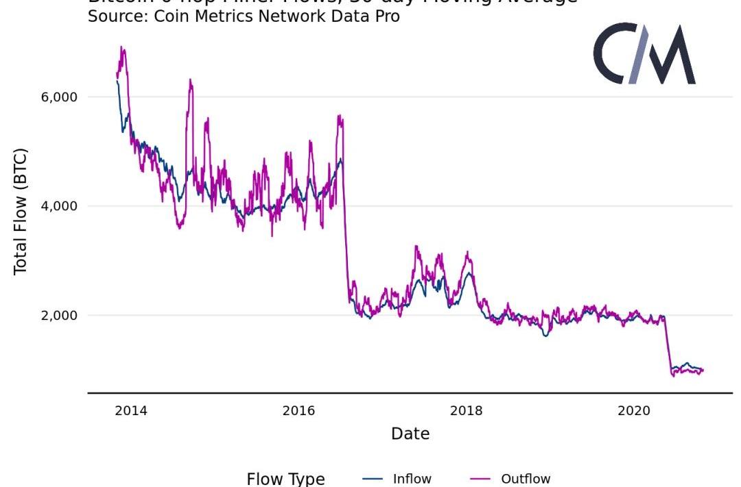 XRP/HKD-2.83%編者按:本文來自加密谷Live,作者:KarimHelmy&CoinMetricsTeam,翻譯:李翰博,Odaily星球日報經授權轉載。摘要本報告使用一種新的方法,從交易的地址對礦工的持有量和鏈上活動進行量化。這種方法改進了之前追蹤礦工支出,因為這實質上衡量了礦池運營商的活動,而不是礦工行為。礦工在減半之前的一年里,從低谷到高峰,累計增持了31.8萬BTC。隨著礦工持有的供應量逐漸減少,其地址的凈流量趨于穩定,礦工似乎對網絡的影響越來越小。礦工和市場