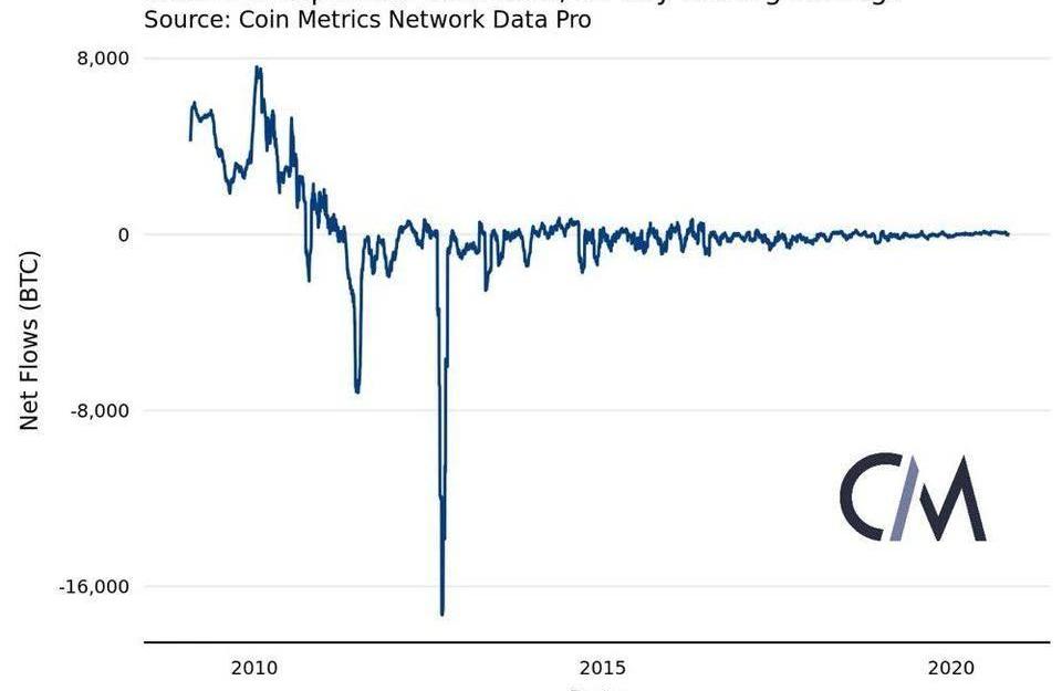 單獨來看,地址資金的流入和流出對于衡量礦工參與的經濟活動量很有用。在比特幣網絡多數時間的歷史記錄中,來自0-hop地址的凈資金流一直略為負值,這些地址的支出通常高過收入。盡管網絡初期的凈資金流波動較大,但隨著時間的流逝,其波動性已逐漸降低,這可能是由于比特幣產量減半的原因。