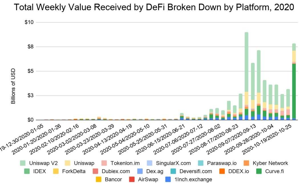 今年大部分DeFi的增長可以歸功于四個平臺,分別是Uniswap、Kyber、CurveFinance和1inchExchange。這五家都是DEX,其中1inchExchange是一個聚合器,讓用戶可以在幾個不同的DEX上獲得各種資產。