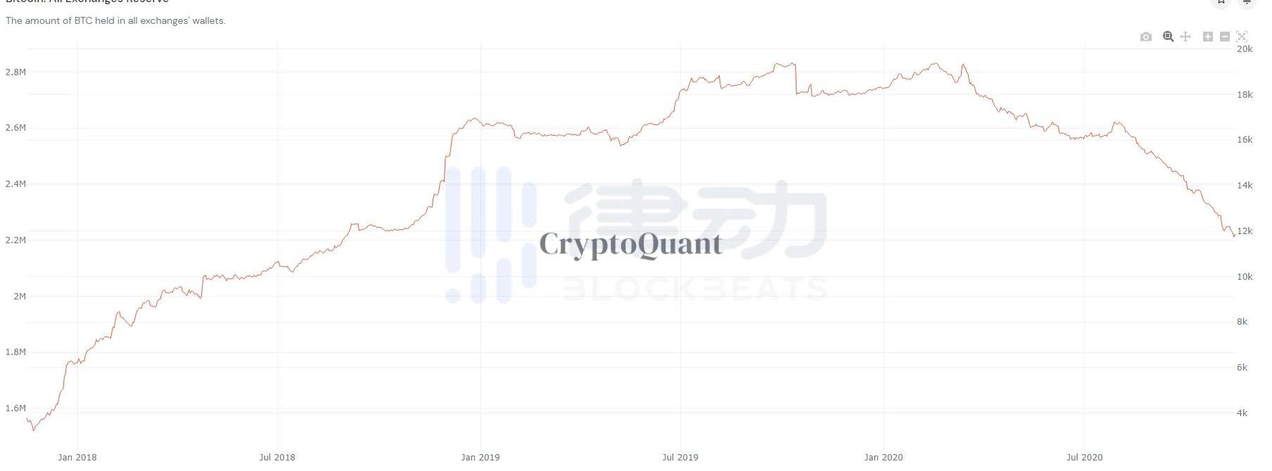 來源:Whalemaps圖表上的泡沫代表未用完的比特幣或累積的比特幣被套現的價格。盡管大多數比特幣都在盈利狀態,但是機構都選擇繼續持有而不是記入未實現利潤。這可能是對散戶投資者和交易員的一個信號。除非上圖所示的這些數據出現大變動,否則比特幣在現貨交易所的價格可能不會出現大幅下跌。根據CryptoQuant的數據顯示,隨著比特幣價格持續攀高,流入交易平臺的資金卻未出現明顯增長,這看起來非常像機構性的FOMO。從MicroStrategy直接從資產負債表上購買價值5億美元的比特幣開始,這已經變成了機構層面的FOMO。隨著機構購買HODL,現在可能是利用現貨交易平臺波動性獲利的恰當時機。然而,一旦機構開始出售比特幣,我們可能會看到比特幣的價格直線下跌,直到交易量枯竭。不過,目前看來交易平臺內錢包的比特幣數量卻持續減少,已達到2018年10月水平,不少用戶還是選擇了持倉觀望。