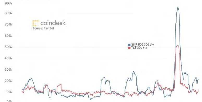 另一個潛在的原因是對沖波動性。理論上,股票的波動性比債券大,因為它們的估值取決于更多的變量,但在實踐中,債券的波動性往往比股票大,如這張TLT長期債券指數的30天波動率圖: