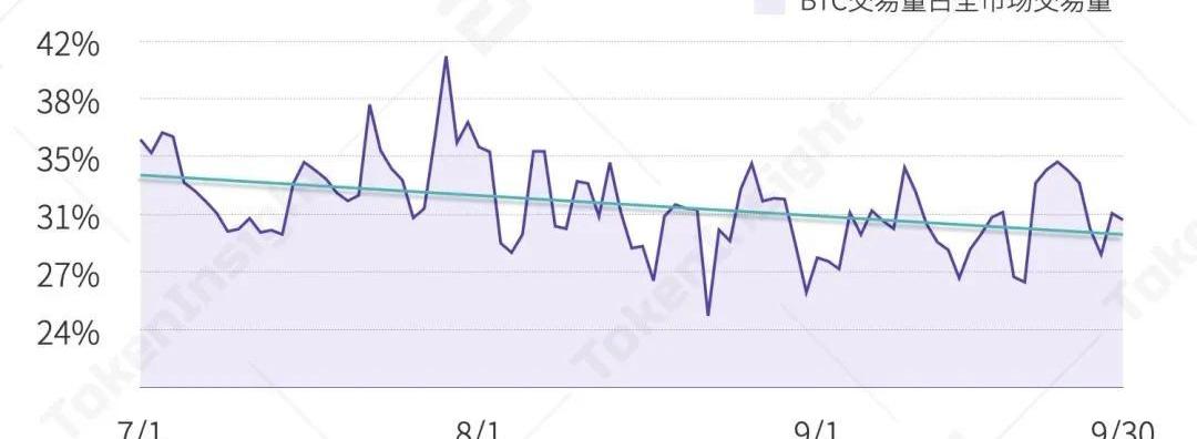 交易量異常幣種成交量走勢,來源:TokenInsight“BTC現貨成交量占比持續降低,熱點板塊帶動部分幣種實現交易量超平均增長本季度BTC現貨成交量降至全市場現貨成交總量的31.4%;其中九月僅占30.4%。TokenInsightResearch分析BTC交易量占比的下降與本季度DeFi、波卡等熱點板塊的出現有關。DeFi在本季度的持續火熱使市場上出現許多實現高回報的選擇,而此類幣種交易量在本季度的增長也遠超平均。