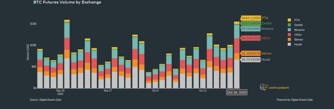 BTC期貨交易量來源:DigitalAssetsData如上所示,Cointelegraph和DigitalAssetsData反映了10月份多個交易所的期貨交易量大幅增長。據ArcaneResearch的分析師稱,Bakkt的400份BTC合約將于10月份到期。數據顯示,與去年9月相比,這一數字增長了14%。Bakkt的交易量和未平倉頭寸對于衡量機構活動非常重要,因為它與LMAXDigital和CME是機構廣泛使用的三個平臺。因此,ArcaneResearch表示,Bakkt的期貨合約交割量的大幅增加表明機構需求在增加。研究人員指出:本月在Bakkt上又有一個創紀錄的BTC交割量。10月到期的BTC期貨合約超過400份,比9月增加14%。隨著Bakkt本月再創新高,機構投資者對比特幣的需求正在增加。除了Bakkt上的高交易活動之外,LMAXDigital和CME也在不斷顯示出巨大需求。Skew的數據顯示,LMAXDigital仍是全球交易量最大的現貨交易所。據Skew統計,LMAXDigital在過去24小時內處理了價值1.356億美元的比特幣交易。這超過了Coinbase、Kraken和其他主要以散戶為主的交易所的日交易量。