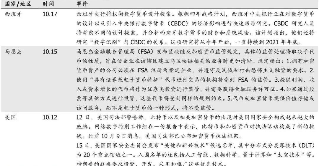 11家美國上市公司/公開交易產品持有比特幣,傳統資本加速布局加密貨幣資產。10月8日,移動支付巨頭Square突然宣布,已投資了5000萬美元的比特幣。五天后,管理著超過100億美元資產的資產管理公司StoneRidgeHoldings透露,作為其資產儲備策略的一部分,該公司購買了1萬多枚比特幣,價值約1.14億美元。根據公開資料統計,目前共有11家上市公司或公開交易產品持有比特幣,總量為592806枚比特幣,約占比特幣流通量的3.2%。其中,GrayscaleInvestments旗下基金產品GrayscaleBitcoinTrust持有的比特幣最多,達449596枚,其次為CoinShares、納斯達克上市公司MicroStrategy和多倫多證券交易所上市公司GalaxyDigitalHoldings,分別持有69730枚、38250枚和16651枚比特幣。另外,還有3iQTheBitcoinFund、Square、Hut8Mining、VoyagerDigital、RiotBlockchain、CypherpunkHoldings和ArgoBlockchain等公司也持有一定數量的比特幣。傳統資本布局加密貨幣市場已形成趨勢,而通常買入的第一個產品就是比特幣。灰度以太坊信托正式獲得SEC批準,加密貨幣市場監管趨于積極。10月12日晚,加密貨幣資產管理公司GrayscaleInvestments官方推特宣布,其此前向美國證券交易委員會提交的以太坊信托注冊申請已正式獲得通過。至此,灰度以太坊信托已成為其旗下第二個獲得許可的數字貨幣投資工具。此前1月,灰度比特幣信托成為首個符合美國證券交易委員會標準的數字資產工具。這意味著,該信托基金及其份額現已根據《證券交易法》進行登記,此前,Grayscale已于2020年10月2日提交了10號表格的注冊聲明。這是繼灰度比特幣信托基金于2020年1月21日上市后,第二個成為SEC申報公司的數字貨幣投資工具。灰度以太坊信托基金只投資于Ethereum,其份額旨在為投資者提供一種具有成本效益的方式來獲得Ethereum風險,由于注冊的結果,擁有或購買信托份額的投資者有了更早的變現機會。截至10月14日,灰度發起的比特幣信托基金持有的比特幣價值36億美元,占比特幣最新市值的約2%。隨著加密貨幣監管趨于積極,將會有更多的合規加密貨幣金融產品上線。Filecoin主網啟動,分布式存儲將開辟新的存儲應用市場。擁有較高市場關注度的分布式存儲項目Filecoin主網在區塊高度148888啟動,開啟分布式存儲應用探索。Filecoin是星際文件系統協議IPFS的激勵層應用,通過區塊鏈的Token激勵模型構建了一個去中心化存儲網絡。分布式存儲采用不同于傳統中心化存儲的資源和市場激勵方式,不僅僅是充分利用分布式節點資源,而是為個人節點貢獻的內容投入市場交換創造了基礎,從而深度挖掘數據內容價值、開辟全新的應用市場,這在傳統的互聯網公司控制中心云平臺數據的情況下是無法實現的。同時,分布式存儲與中心化存儲將不斷融合,改變現有的互聯網構架和商業模式。市場通常將分布式存儲視為一種新的技術,而忽略了分布式存儲帶來的個人存儲資源、用戶內容貢獻價值挖掘和市場交換的潛力。在分布式文件系統的互聯網上,個人存儲資源可以投入到市場進行資源交換,為用戶貢獻的內容在數據確權、安全的基礎上進行內容價值提供市場交換的平臺。因此,分布式文件系統將會催生更多的全新的互聯網應用,而非傳統互聯網的技術迭代。二、各國政府相關新聞:馬恩島金融服務管理局發布區塊鏈及加密貨幣監管規定