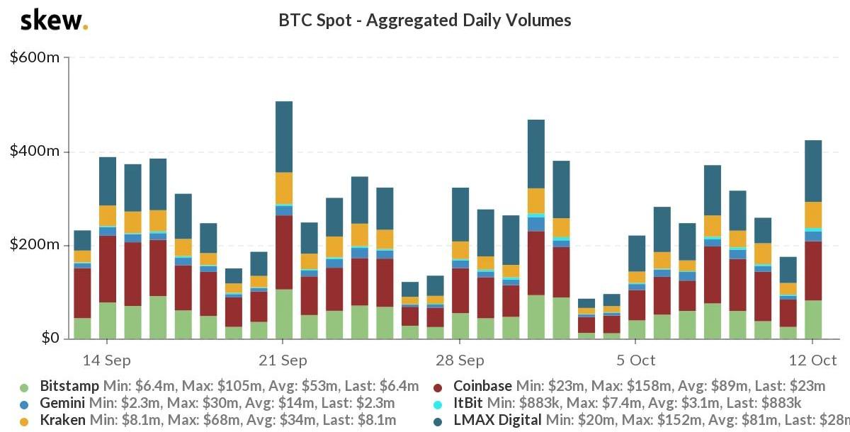 Whalemap的研究人員表示,自10月初以來,鯨魚之間的場外交易一直在增加。Whalemap是一個追蹤鯨魚活動和高凈值投資者交易的平臺,它發現,尤其是在重大消息公布前后,個人交易量顯著增加。他們說:“我很期待看到更多的場外交易達成,而且確實如此。我越來越傾向于這樣一種觀點,即在消息公布之前,你可以看到這些場外交易正發生在鏈上。”在機構和鯨魚的活動活躍的同時,現貨市場的總交易量也在不斷增加。