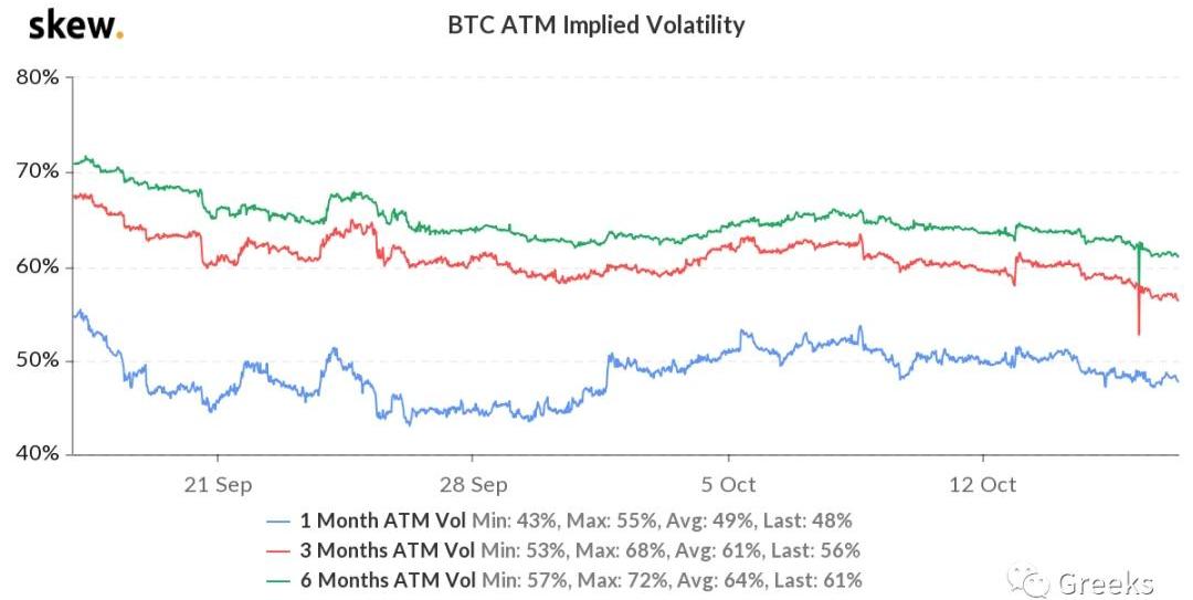BTC歷史波動率10d28%30d33%90d49%1Y80%期權持倉量14億美元,期權成交量0.11億美元。各標準化期限隱含波動率:今日:1m48%,3m56%,6m61%10/16:1m48%,3m58%,6m62%