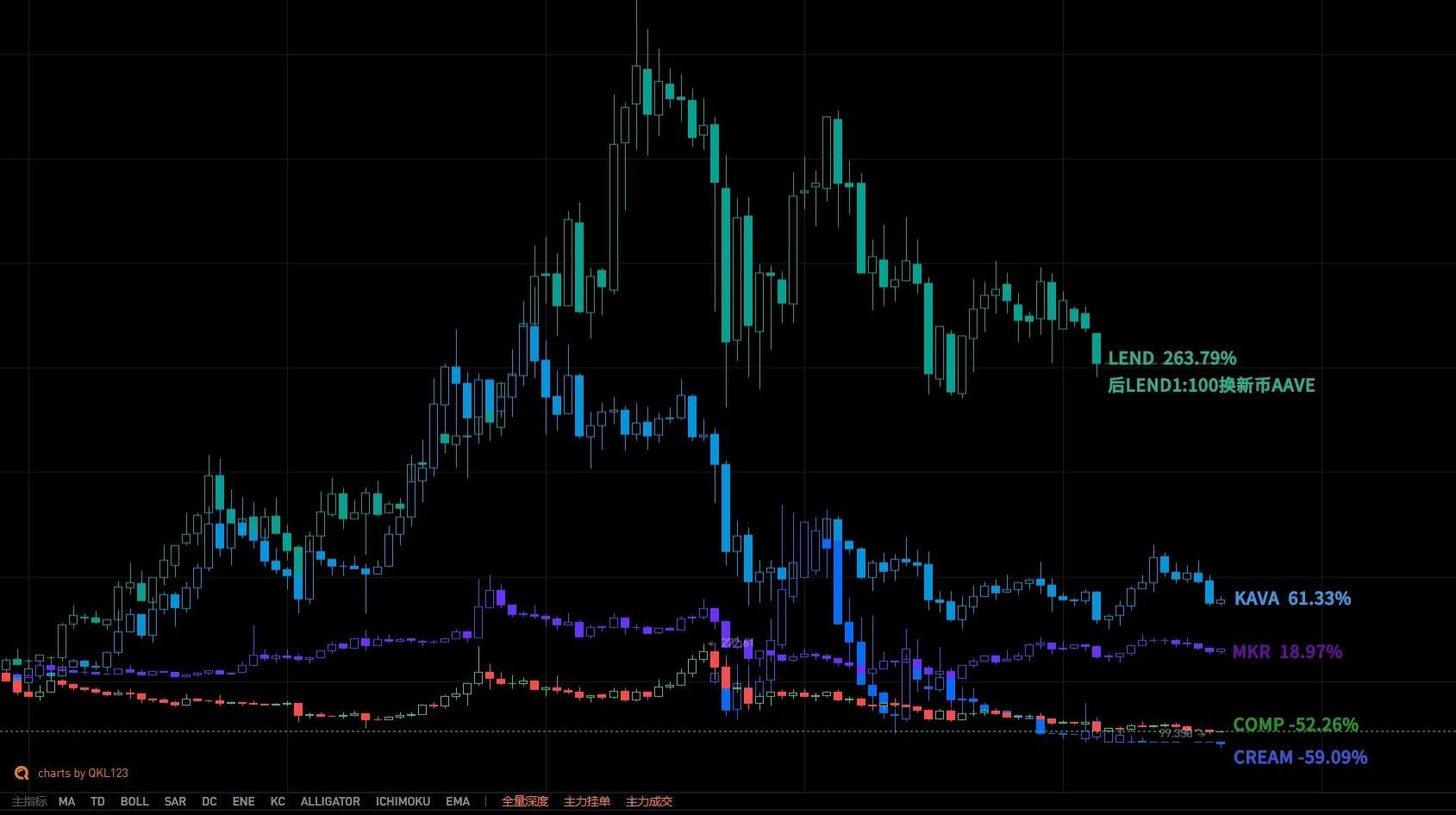 來源:QKL123上圖為Q3借貸類項目代幣的市場走勢概況,包括MKR、COMP、LEND、KAVA和CREAM五個項目。如圖所示,借貸類資產類別中Aave的治理代幣LEND表現最佳,漲幅高達263.79%,需要注意的是Aave的協議代幣已從LEND遷移到新幣AAVE上;KAVA表現次之,漲幅達61.33%;COMP和CREAM表現得最不盡如人意,跌幅分別為52.26%和59.09%;MKR表現一般,漲幅為18.97%。2.2.2借貸市場概況圖2-5借貸市場概況