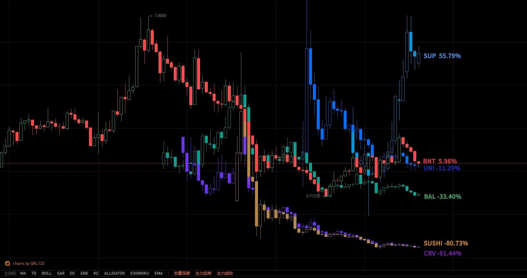 來源:QKL123,FTX上圖為FTX的DeFi指數,該指數由一籃子熱門DeFi代幣組成,包括KNC,LEND,MKR,KAVA,ZRX,LRC,REN,REP,BNT,SNX和COMP,可用以反映DeFi市場的整體發展情況。如圖所示,第三季度DeFi指數7月1日最低為1525,9月1日達到峰值3403.7,此后雖然大幅回落但仍高于7月之初,Q3整體發展可分為三個階段:第一階段,蓬勃生長期。自6月底Compound引領流動性挖礦之始,一大波流動性挖礦的DeFi項目蜂擁而至,包括DEX龍頭Curve、Balancer,算法類穩定幣AMPL以及保險賽道龍頭NexusMutual,皆在7月初入場,流動性挖礦熱潮隨即開啟,至9月1日SushiSwap流動性挖礦推動,市場達到高潮。第二階段,急速回歸期。自9月初,一度占領DEX市場份額前三的SushiSwap大事頻出,對市場情緒影響較大,SushiSwap匿名創始人ChefNomi賣出devpool的全部SUSHI,造成SUSHI大跌,并帶動市場下挫。此外,DeFi項目智能合約漏洞頻出,SushiSwap仿盤KIMCHI.finance智能合約存在漏洞,智能合約擁有者可以利用漏洞,無限制地增發項目對應的代幣數目,繼而導致通脹并最終崩潰,其代幣價格一日之間跌去72%;EOSDeFi流動性挖礦項目EMD合約emeraldmine1的大量質押資金被轉移……至9月23日達到低谷。第三階段,價值尋找期。在經歷市場暴漲、暴跌之后的DeFi市場,流動性挖礦沒有高年化的吸引,熱度也逐漸褪去,資金逐漸回流大盤,推動比特幣重回11000,DeFi指數在1800-2200之間小幅徘徊,進入價值尋找期。1.3市場概況