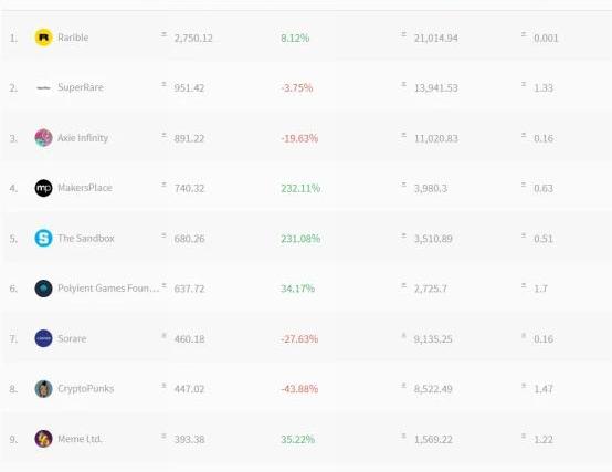 存入Uniswap資金池可挖取的NFT卡牌在MEME的牽頭下,市場出現三種不同類型的NFT+DeFi項目;比如在去中心化金融項目中引入NFT概念的MEME、DEGO,抵押NFT進行DeFi挖礦的WHALR、CARGO,以及直接在NFT平臺引入流動性挖礦的Rarible。其中MEME、WHALR、DEGO等項目的代幣上線之初價格皆出現翻倍增長;而Rarible啟動流動性挖礦后,不到兩個月時間交易量就趕超老牌交易所OpenSea,成為當前最大的NFT數位收藏品交易平臺,近7日交易量達2750ETH,在該領域位列第一。