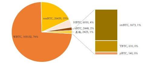 圖2:以太坊上的比特幣數量來源:https://btconethereum.com/更細致地來看,目前以太坊上的比特幣錨定幣主要有七種,圖2描繪了具體的組成比例。可以看到,WBTC是目前占比最高的比特幣錨定幣,數量已超過10萬個,其次為renBTC和HBTC,占比微乎其微的則是TBTC和pBTC。