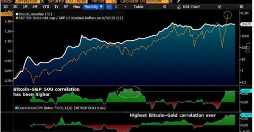 目前,比特幣市場規模還不到2,000億美元,對于包括中央銀行在內的許多大型機構而言,這個規模實在太小了,因此無法將比特幣作為其持有量的一部分來添加,但是如果比特幣的市值不斷增加,無疑將變得越來越像黃金的數字化版本。比特幣變得更像黃金——彭博認為,比特幣未來會像黃金一樣,而隨著股市波動性不斷上漲,越來越多傳統市場投資者開始增持比特幣。2020年是自大蕭條之后美國經濟調整最嚴重的一年,納斯達克股票市場價格與GDP比例達到了有史以來最高水平,因此合乎邏輯的分析是,預計大多數資產將越來越多地受到股市動蕩的影響。通過分析,彭博認為自2010年中以來比特幣與黃金之間的關聯性創下歷史新高,此外與標準普爾500指數之間的關聯性也一直較高,所以比特幣正在趨向于成為“數字黃金”。比特幣將保持黃金相似的市場走勢