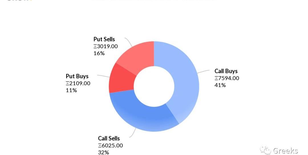 以太坊短期IV幾乎與前日持平,這說明此次上漲幅度不及比特幣,更還沒有達到突破或其他重要點位。以太坊的各期限IV變化同步,中遠期這個值比較穩定,短期目前是偏低的。今天CallBuys占比很大,成交7594ETH,占總成交量的41%。CallSells成交6025ETH,占總成交量的32%。Call成交量顯著高于前幾日,相信在未來ETH的期權發展可以比擬BTC。
