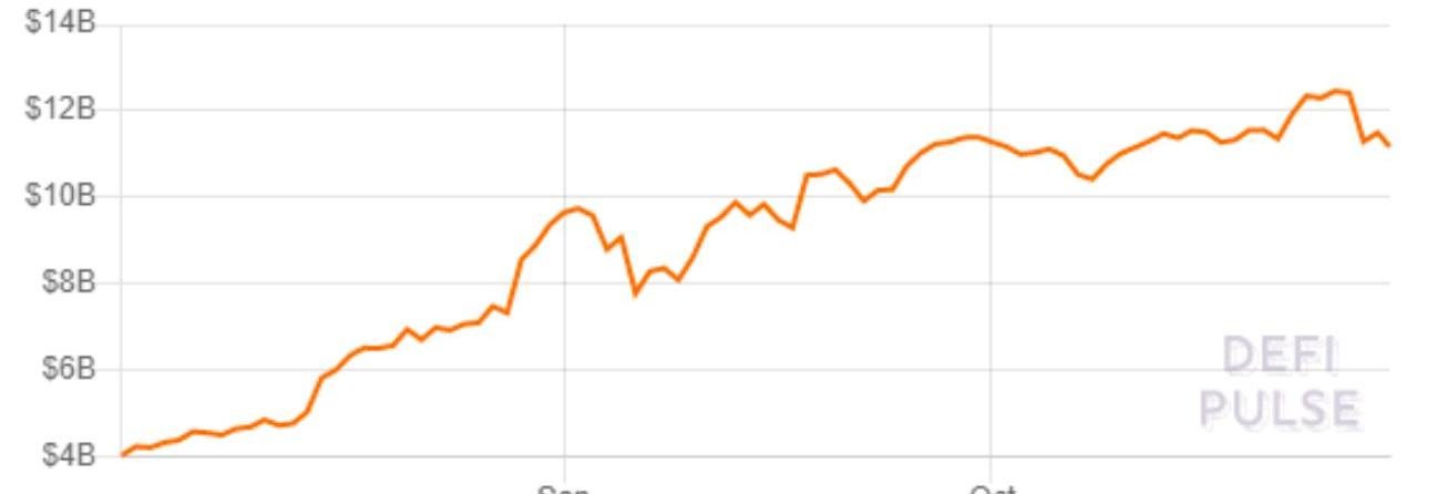 每周DEX交易量來源:DuneAnalytics盡管DeFi資產出現了大幅回調,交易量減少,但鎖定的總價值仍接近創紀錄的高位。DeFiPulse的數據顯示,目前鎖定的總價值為112億美元,較10月25日的歷史高點124.6億美元略有下降。