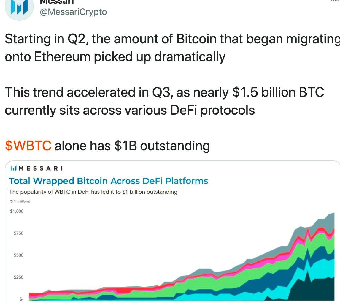 2、第三季度Aave和MakerDAO未償債務分別增長1309%和529%據Messari數據圖表顯示:截止第三季度結束,MakerDAO的未償債務從二季度的1.4億美元提升至8.5億美元,增長529%。而Aave更為亮眼,未償債務從2000萬美元增長到2.5億美元,漲幅為1309%。而這兩個平臺沒有任何流動性挖礦的激勵。值得注意的是,在第三季度,Aave收益率增長了197.4%。從MakerDAO借出的每一分錢都是債務,未償還債務越大,說明這個應用根基越牢固。DeFi世界是這樣,CeFi世界亦然,我們經常看到某巨頭房產公司負債萬億,只要現金流健康,就能持續運營下去。3、數據:近15億美元BTC存在于各種DeFi協議中Messari數據顯示,從第二季度開始,轉移到以太坊的比特幣數量急劇上升,這一趨勢在第三季度加速。目前有近15億美元的BTC存在于各種DeFi協議中,僅WBTC一家就有10億美元未償債務。以各種形式鎖定在DeFi生態中的BTC,達到15億美元,這其實是DeFi在為以太坊“輸血”,這種輸血達到了三重目的,即價值捕獲、流量捕獲與信用背書。