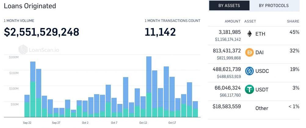 數據顯示在10月21日,目前借款總量在$23億美金,其中50%均來自Compound。