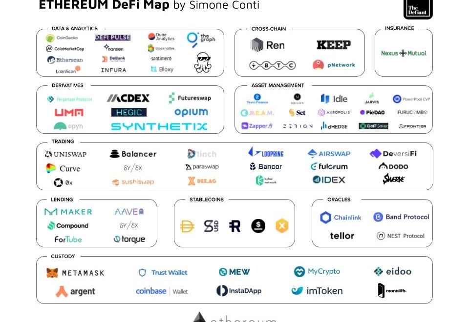 雖然renBTC的數量遠不如WBTC的數量,但WBTC并沒有發幣,用戶并不能從中分一杯羹。那么如果btc持續進入DeFi生態,最先收益的DeFi協議,還會有那些呢?是借貸aave,去中心交易所uniswap嗎?且看看ETH上的DeFi生態圖譜。