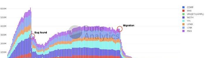 流動性挖礦項目并不是在真空中運作的——流動性提供者積極評估他們參與項目的機會成本,讓他們參與的有效方法是與他們目前所在的社區激勵相容。YAM在這方面做得很好,針對DeFi中最大和最活躍的token,它社區推出了8個流動性池。YAM的增長令人印象深刻——在發現合約漏洞之前,它在24小時內鎖定的總價值超過5億美元: